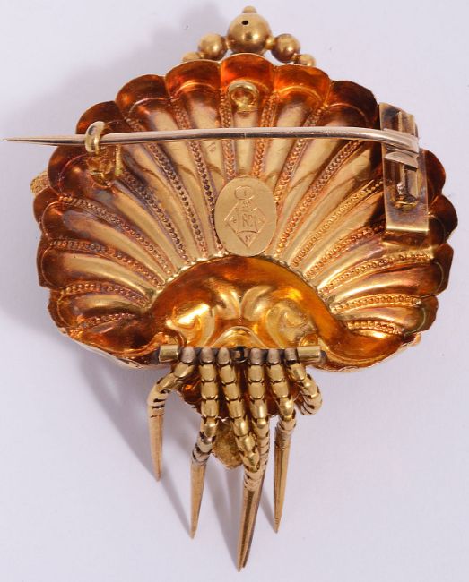 circular and drop cut amethysts all spitch set with bead finals, set amongst a spray of four fern leaves, to a scalloped shell background, with a graduated bead accent and tassel drops in a fitted Nathan & Co box