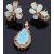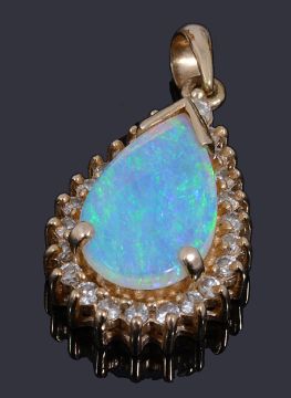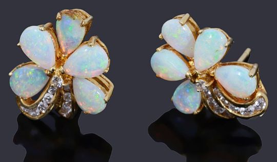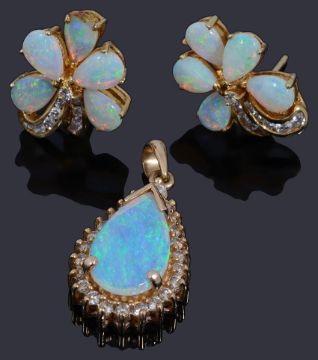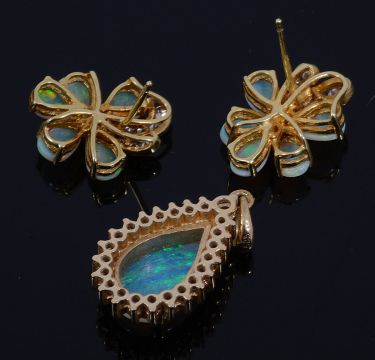 a brilliant cut central diamond claw set to five pear shaped opals petals with two curved sprays of graduated brilliant cut diamonds to post fittings and a pear shaped opal cabochon pendant with a surround of brilliant cut diamonds, all claw set with a tapering bale, marked 585 (2)
