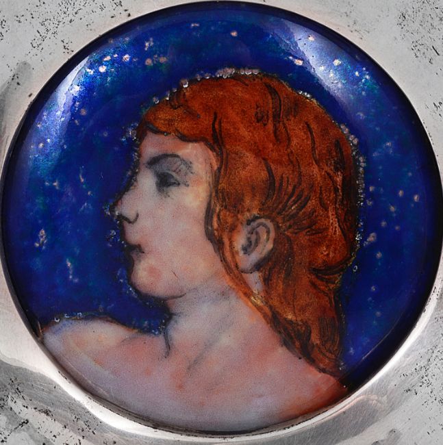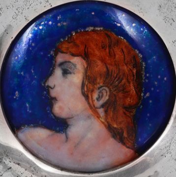 An Arts & Crafts enamel on copper portrait roundel in a circular silver frame