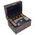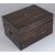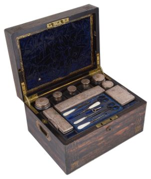 Condition: Some brass inlay absent from rear edge of lid. Brass inlay and sunken handles partially oxidised. Polish of lid partially affected by damp. Interior velvet slightly rubbed. Two items from manicure set absent. All scent bottles have stoppers. One scent bottle has a slightly damaged thread on bottle, otherwise glass bottles and jars in good condition with minor fleabites. One silver top for scent bottle has a split running round edge of top and is slightly pushed