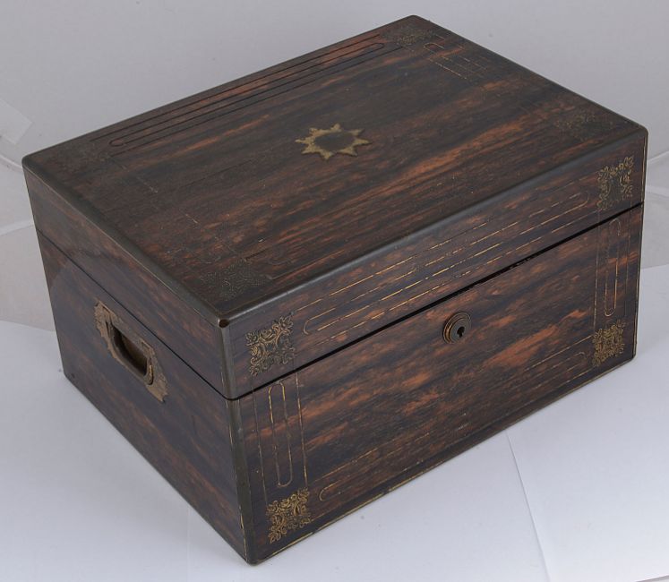An early Victorian ladies coromandel and brass inlaid dressing box with silver mounted fittings