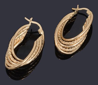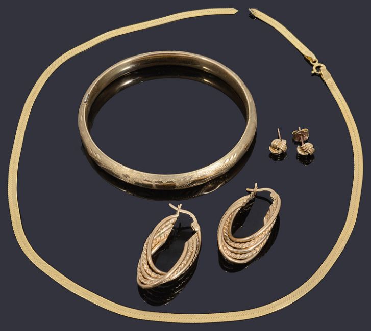 to include a pair of 9ct gold twisted hoop earrings, a pear of gold studs marked 9ct, a gold hollow hinge bangle with diamond-cut decoration and a cobra link chain marked 375 (4)