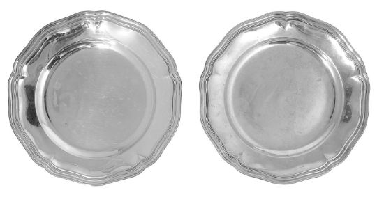 each of circular form with raised petal shaped border with moulded rim, (6)