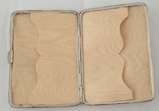 of rectangular form, the centre inlaid with a silver basket and swags of floral garlands to a tortoiseshell background and a silver raised border, hinged to one side with a taffeta lined interior