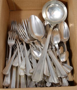 comprising twelve dinner forks, twelve tablespoons, twelve dessert forks, twelve teaspoons, twelve silver handled table knives with stainless steel blades, twelve dessert silver handled dessert knives with stainless steel blades, a soup ladle, a serving spoon, a serving fork and two additional silver table knife handles, (101)