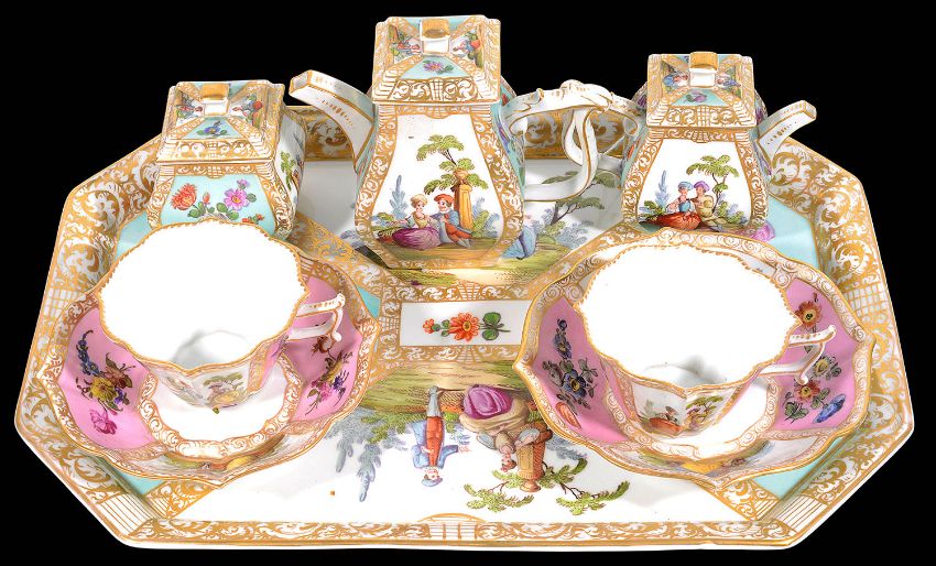 An early 20th Century Dresden matched porcelain tete a tete cabaret tea service
