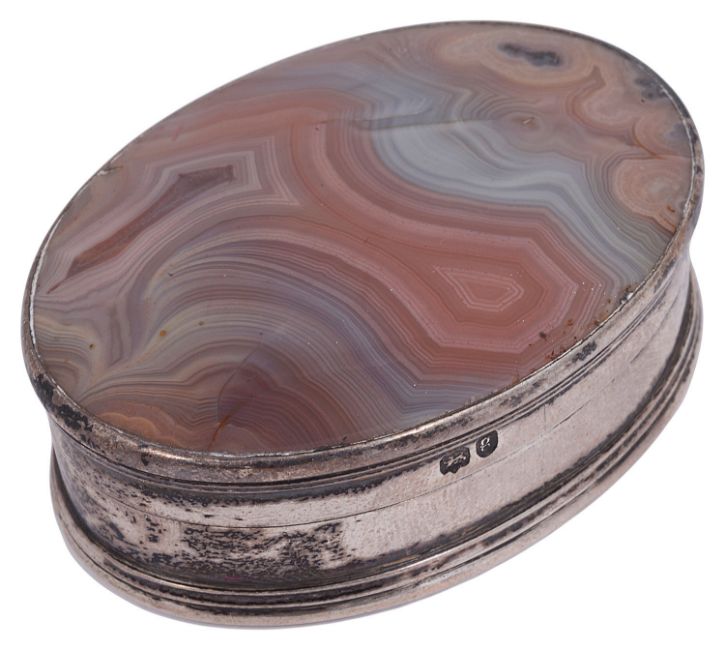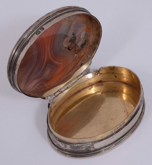 of oval form, the hinged mounted with a panel of banded agate, having reeded borders and gilt interior