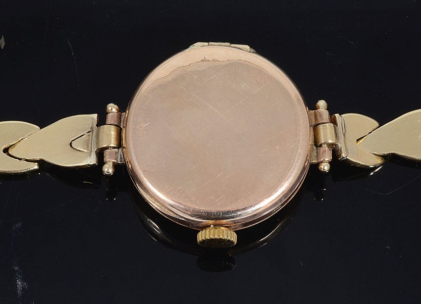 with silvered dial and Arabic numerals at each quarter point on a gold wheat link bracelet marked 585