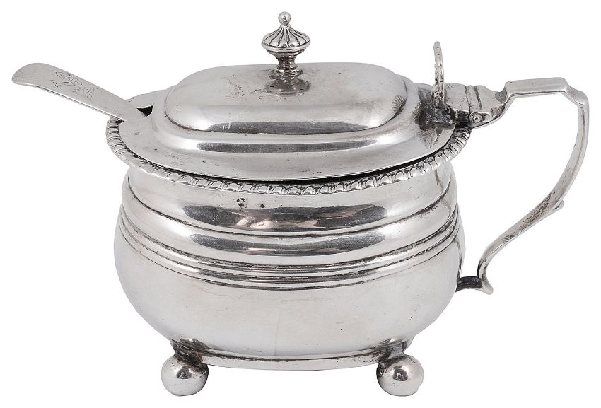 of oblong bellied from, having gadrooned rim and domed hinged cover with shell thumbpiece and knop finial, raise don ball feet, fitted with a blue glass liner, accompanied by a Victorian fiddle pattern mustard spoon, (2)