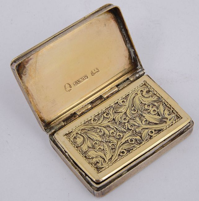 of rectangular form, the hinged cover with vacant cartouche, gilt interior with foliate engraved pierced grille