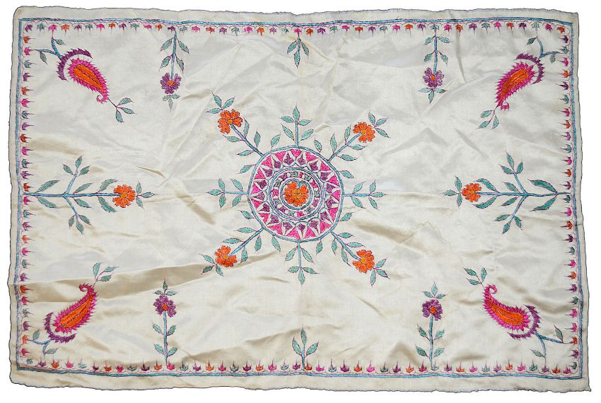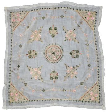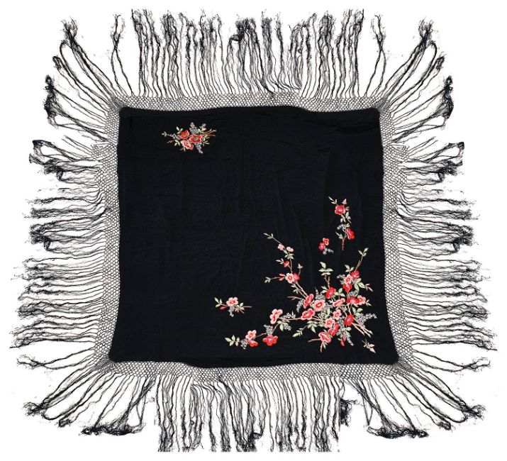 piano shawl excluding fringe approx: 107 cm x 112 cm Fringe each side approx: 40cm, Indian silk panel: 90 cm x 52 cm, chiffon panel approx. 82 cm x 82 cm, silk pane approxl: 49.5 cm x 74.5 cm