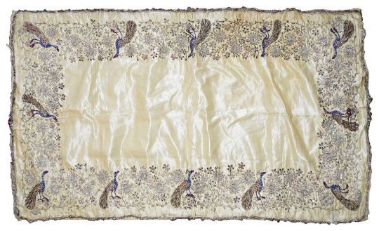 to include a black silk piano shawl highly embroidered with floral motifs and with a macramé fringe circa 1920s, an Indian pale yellow silk panel highly embroidered with silver metallic threads and peacock motifs, on a cotton backing and two further Indian pieces of textiles to include a chiffon panel embroidered with gold metallic and silk threads (4)