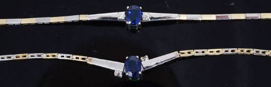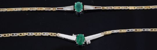 the centrepiece composed of an oval cut synthetic sapphire and to the reverse an oval cut emerald, each set with a single brilliant cut diamond, claw set between two tapering shoulders to a two colour gold bar link chain with box clasp fitting stamped 585 and a matching bracelet (2)