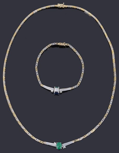 An attractive two-colour gold reversable synthetic sapphire, emerald and diamond necklace and matching bracelet.