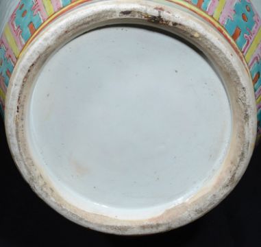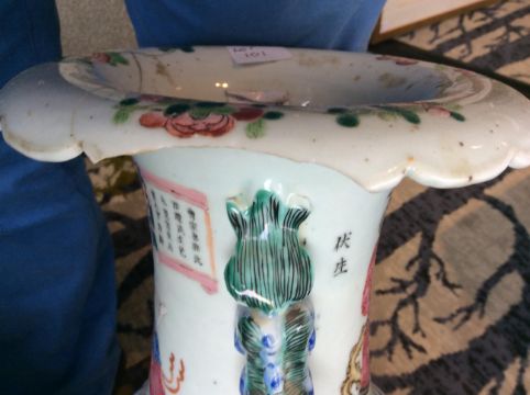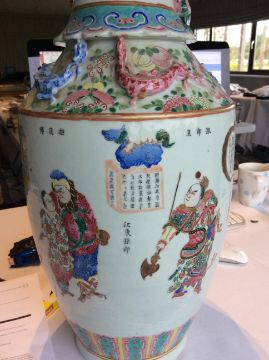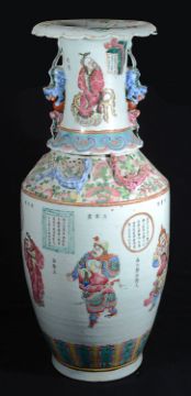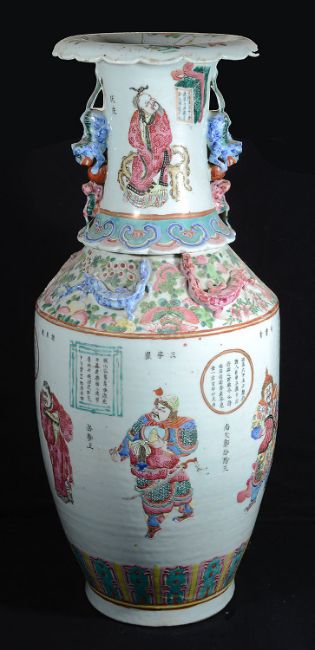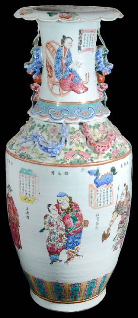 of baluster form, painted with Chinese figures carrying out various activities, with scripts of Chinese characters in various motifs including a peach to a white background, painted with scrolling lizards and dogs of Fo handles