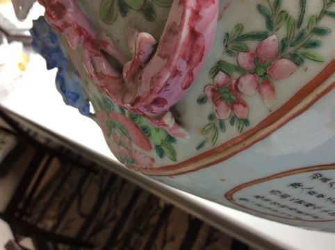 Condition: Condition report: fair, part of the rim missing and cracked in several places. decoration clear and strong, some brown marks to china but can be removed with cleaning