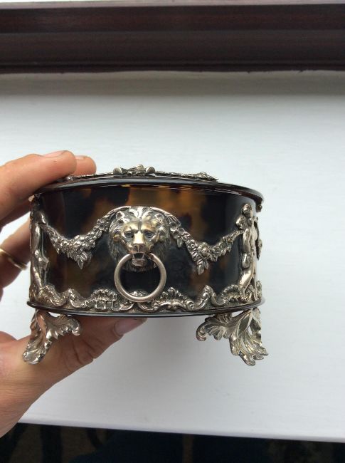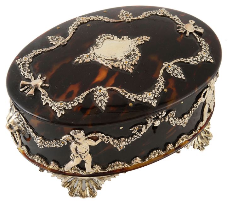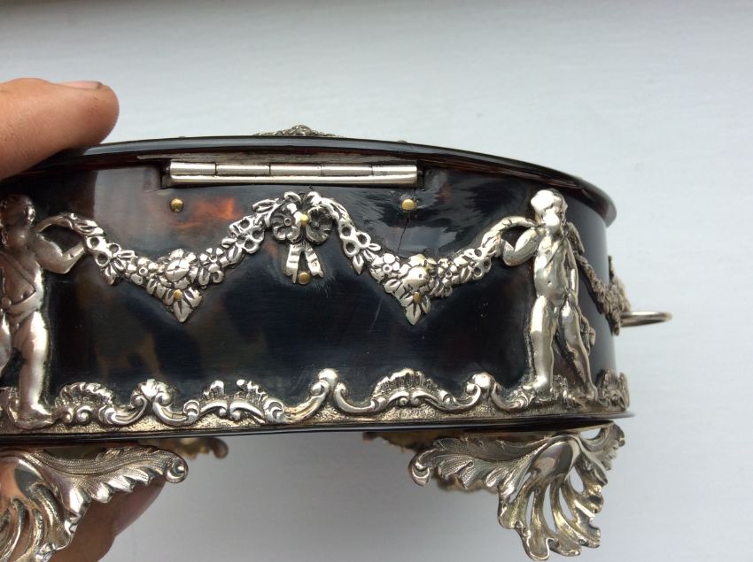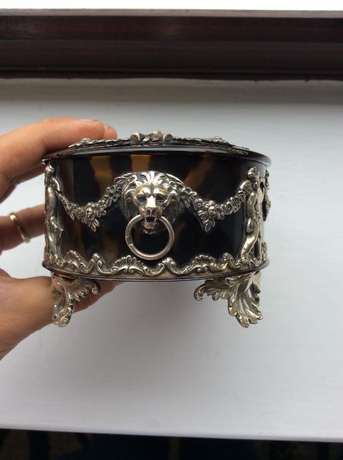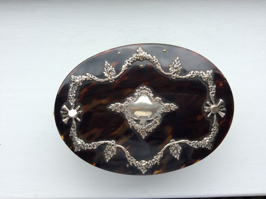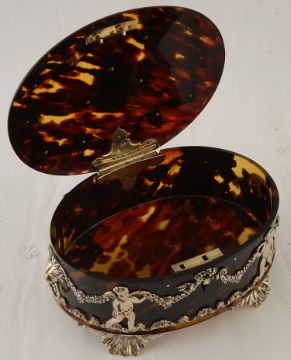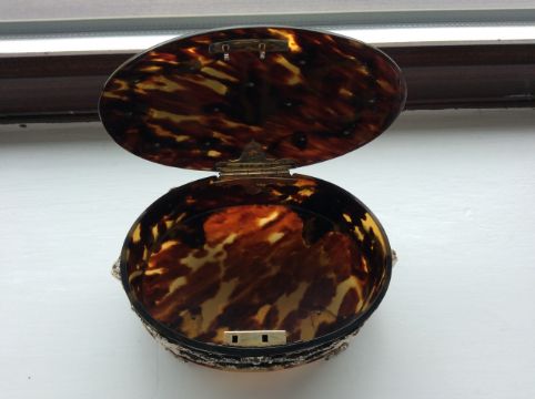 A late Victorian silver mounted tortoiseshell oval jewellery box