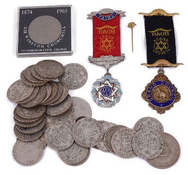 Two Royal Antediluvian Order of the Buffalos silver and silver gilt enamelled jewels and a small selection of mostly post 1920 George V and George VI silver half crowns