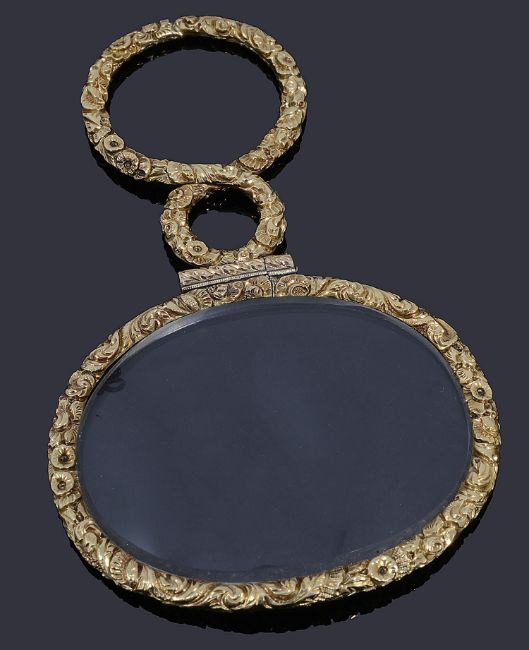 the top section an inlaid cross with a circular border, with silver engraved plaques, scrolls and floral motifs tapering to the hinged bottom section also inlaid together a Victorian gold cased eye glass, the frame highly decorated with flowers, a Georgian agate and flat cut garnet cluster brooch and a silver pink stone cluster ring (4)