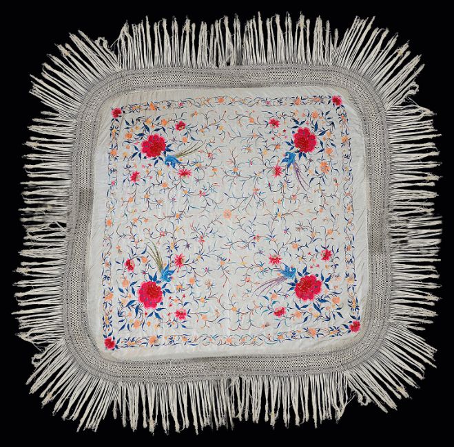 A white silk piano shawl, embellished with floral embroidery and macramé knotted fringe edging