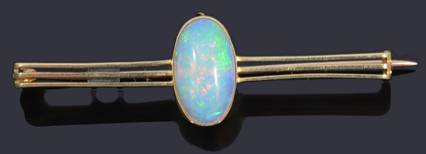 A gold single stone opal cabochon bar brooch and two other brooches,
