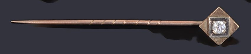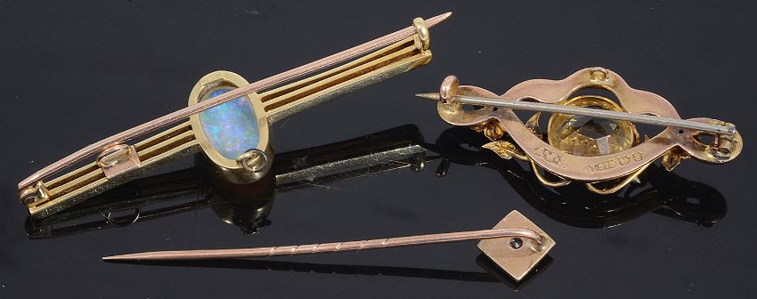 a opal cabochon millegrain set to a three row bar with pin and 'C' scroll catch marked 18ct, a Victorian 9ct gold citrine bar brooch and a gold single stone diamond stick pin claw set to a lozenge mount marked 9ct (3)
