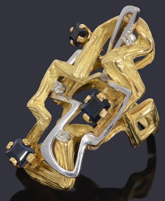 step-cut sapphires claw set to a textured gold abstract form intertwined with a polished white abstract design set with three eight-cut diamonds to open shoulders and a reeded shank, marked 750