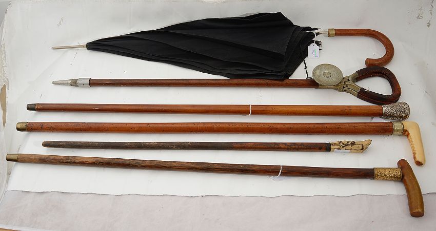 comprising a malacca cane with foliate embossed silver terminal engraved with a Masonic square and compass and presentation inscription, apparently unmarked, an ivory handle malacca stick with plated collar, a holly walking stick with horn handle and gilt metal collar and presentation inscription, a swagger stick with bone terminal carved with a dogs head, a shooting stick with leather handle stamped Mills Munitions ltd and a Paragon S. Fox & Co umbrella with black canopy, (6)