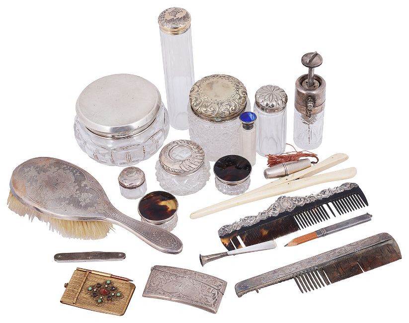 to include a a foliate engraved curved hip card case bearing initials, Birmingham, 1903 by Smith & Bartlam, a chatelaine pencil, a cheroot holder having mother of pearl mouthpiece, a pocket knife, a pair of ivory glove stretchers, stamped sterling, a gilt metal aide-memoire, a sewing etui, a foliate engraved silver mounted cut glass pump action atomiser, a Victorian silver gilt lidded cut glass hat pin jar, various cut glass dressing table pots with silver and plated fittings to include two with tortoiseshell lids and one engraved 'Hair Tidy", a silver backed hair brush and matching comb etc. (qty)