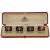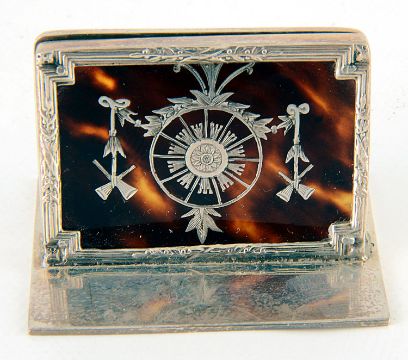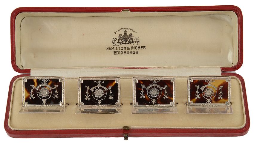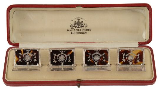 of rectangular form, the tortoiseshell panel with pique work decoration, each numbered A2443, in fitted case retailed by Hamilton & Inches, (4)