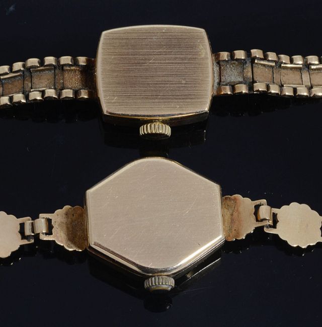 A ladies 9ct gold Bentina mechanical bracelet watch and a ladies 9ct gold Accurist mechanical bracelet watch,the Bertina with a cushion shaped case and champagne dial signed 'Bertina Star', with gold baton markers, diamond-cut engraving to the case with a square link bracelet and ladder snap clasp and the Accurist with a tonneau shaped case and champagne dial signed Accurist, with a floral shaped bracelet and ladder snap clasp (2)total weight including movement 25.2gCondition: Both tick and wind but no guarantee of timekeeping and movement. Bertina: some scratches to the dial, slight wear to the diamond cut engraving bit overall condition goodAccurist: some scratches to the glass, overall condition good