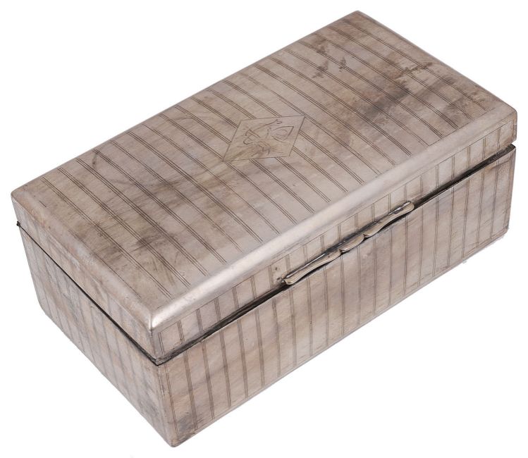 of rectangular form, engraved with a linear design of plain and stippled bands, monogrammed, cedar lined