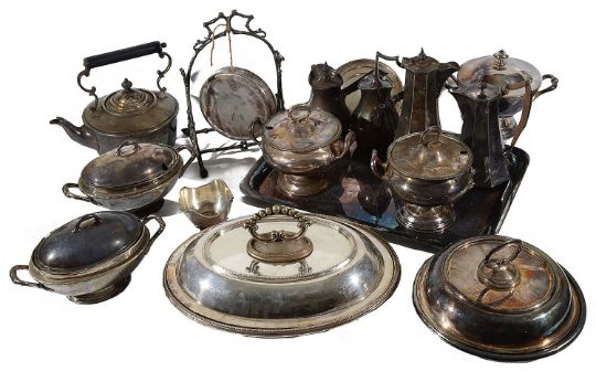 to include a plain rectangular tray by Hukin & Heath, numbered 194, a table gong, a pair of cafe au lait pots with a matching sugar basin, two pairs of sauce tureens and covers, two entree dishes and covers, a teapot, etc., (qty)