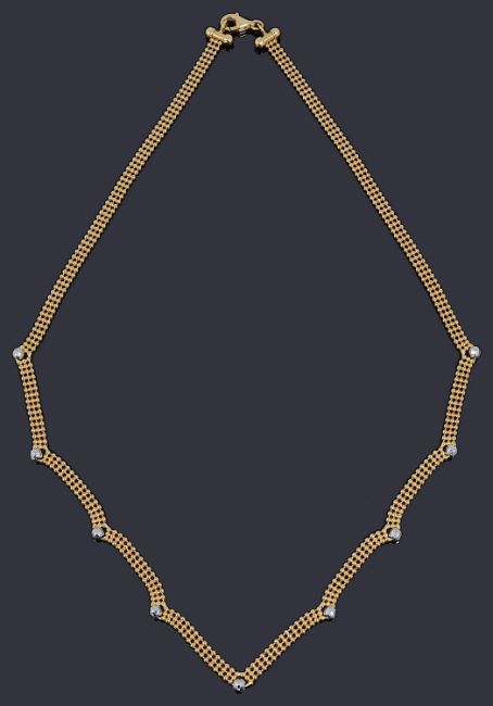 a three row bead chain with scalloped centre and facetted white gold beads to each point, terminating to a lever clasp marked 750