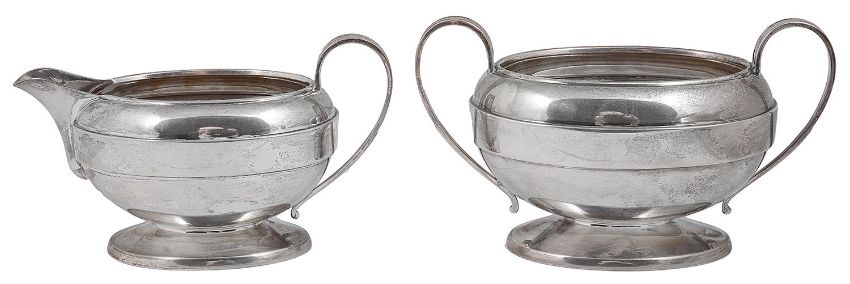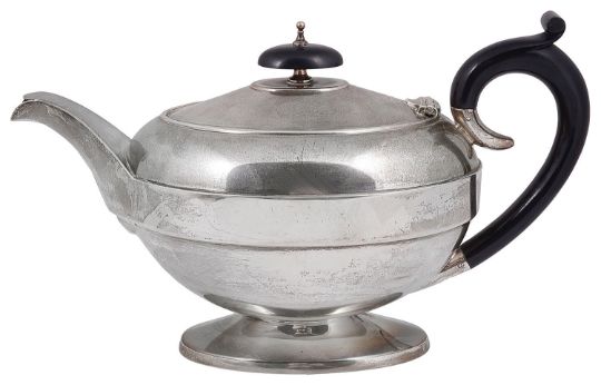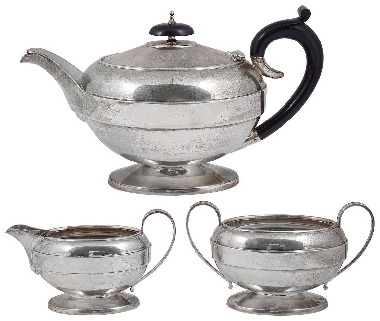 of plain oval form with a raised central band, comprising teapot having ebonsied scroll handled and knop finial, twin handled sugar basin and milk jug, (3)