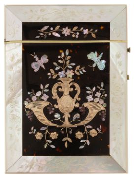 of rectangular form, the centre inlaid with gold urns and mother of pearl butterflies and a floral spray to a tortoiseshell background with an engraved mother of pearl border, the reverse similar with a floral and bird motifs, side hinged with push button release to the right side opening to reveal an ivory and red velvet interior, engraved Mrs Ridley to a gold plaque with leather outer case