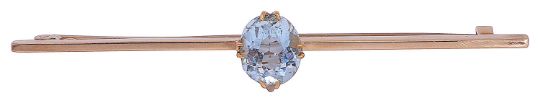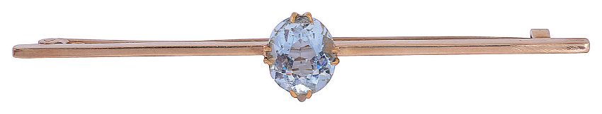 a single stone oval cut aquamarine, double claw set to a plain polished bar with pin and 'C' scroll fitting