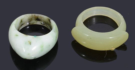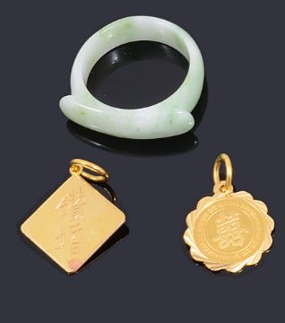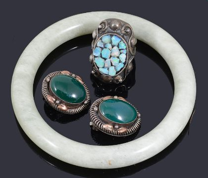to include a high carat gold green paste spray brooch, a white metal jade floral and spray brooch, a gold jade pin, two gold pendants, three hardstone rings and a bangle, a silver brooch with Chinese characters to the centre, a platinum wedding ring, a pair of green hardstone earrings and a silver ring with an opal mosaic centre (qty)