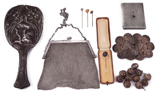 comprising an engine turned cigarette case, bearing London import marks for 1927 by Cohen Charles, of oblong form having cabochon sapphire set push thumbpiece releasing a hinged lid enclosing an interior fitted for seven cigarettes, a chain mesh evening bag, bearing London import marks for 1923 by London Chain Bag Co., the frame engraved "Spring Meeting 1930', two 15ct gold sticks pin, a yellow metal stick pin and another in a leather case, an a/f silver hand mirror embossed with Art Nouveau floral design, a set of eleven white metal cage toggle buttons, possibly Maltese and a silver plated nurses buckle formed of reproduction Roman coins, (qty)