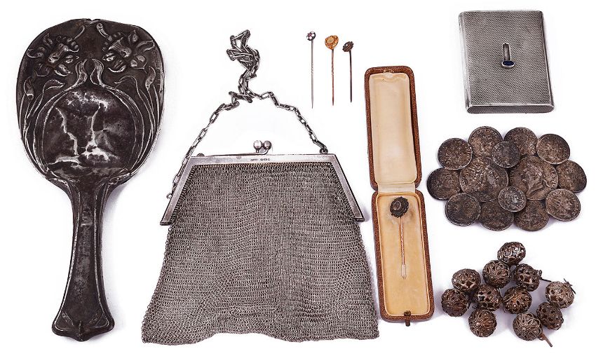 A small selection of mostly silver items of vertu to include a cigarette case, a chain mesh evening bag and gold stick pins