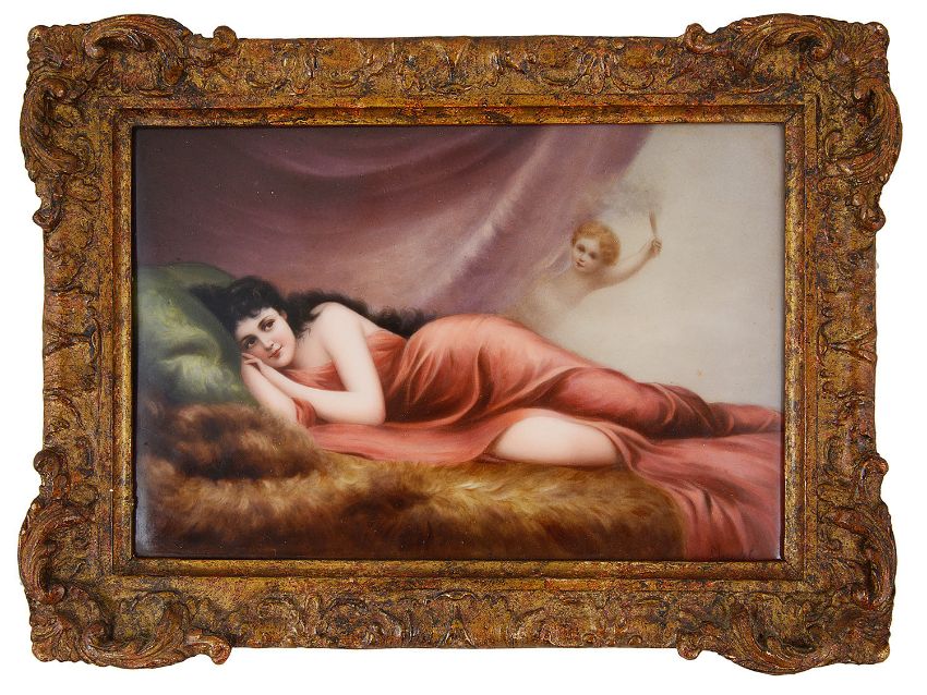 finely painted with a reclining semi-nude maiden on a fur covered bed, behind her a putto bearing a smouldering torch peering round a curtain, signed Meindel, impressed 324 otherwise unmarked, framed