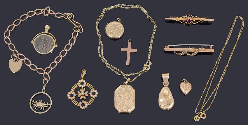 A collection of gold jewellery,to include an Edwardian gold seed pearl circular pendant marked 15ct suspended on a 9ct gold trace chain, a gold nugget pendant marked 9ct, two Victorian bar brooches, a gold curb link bracelet with padlock and zodiac charm, three front and back lockets, a cross pendant marked 9ct and a gold swivel fob with roman coin (qty)total weight approx. 39.1gCondition: Pendant: 3.0g chain. 1.0g, nugget 8.0g bar brooches (pin not gold) 3.3g, charm bracelet 10.6g, lockets 7.8g, cross 0.9g roman coin 4.8gbracelet links worn with replacement clasp. all items wear consistent with age.