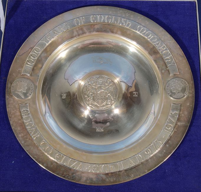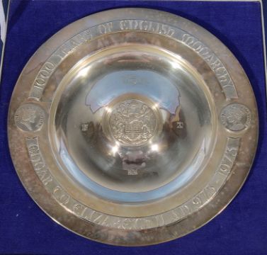 An Elizabeth II silver commemorative alms dish 1000 Years of English Monarchy Edgar to Elizabeth 973-1973