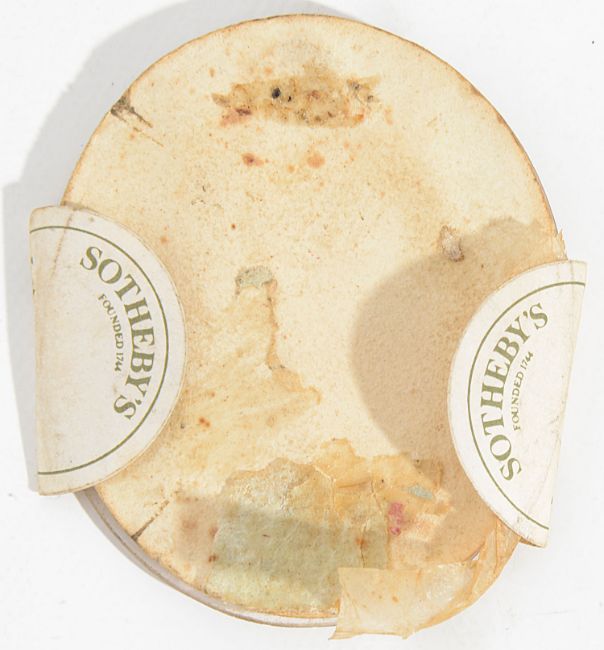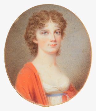 'Portrait miniature of young woman wearing an Empire-line dress and an orange shawl', oval, watercolour on ivory, unsigned, unmounted under glass, bears Sotheby's paper labels