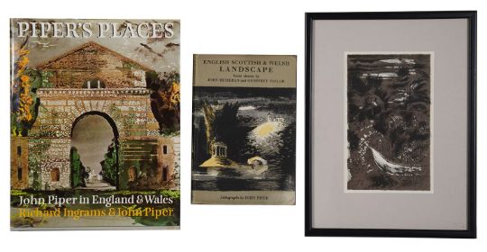 first 1944 1st edition, London Curwen press, illustrated with twelve colour lithograph illustrations, 8vo., original decorated cloth, no d.j., second, 1983 first edition, London, Chatto & Windus, dust jacket., signed by John Piper together with 'Rose Arch', a colour lithograph by John Piper from Richards., J. M. The Castles on the ground, 1946, mounted, framed, (3)