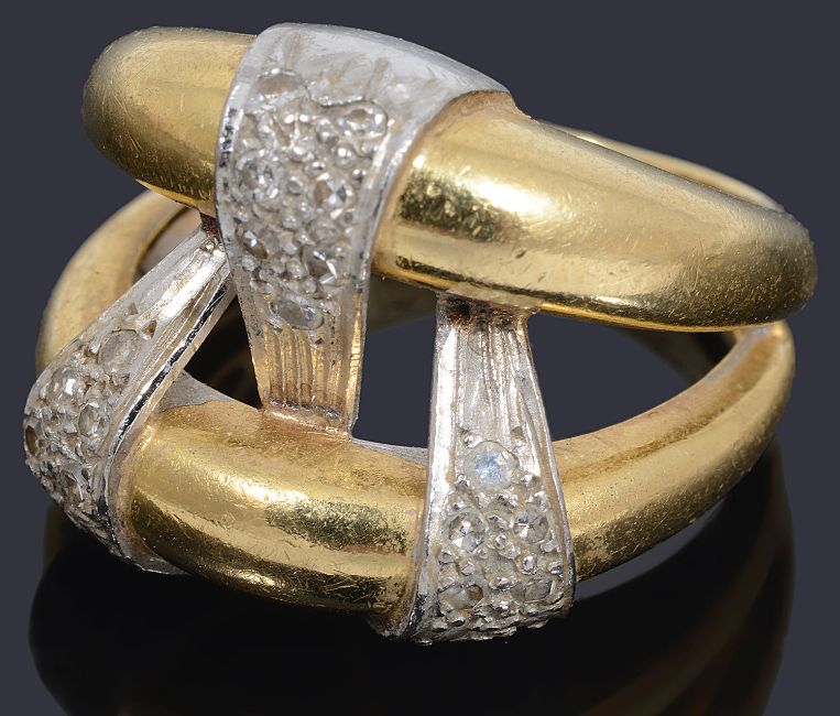 two tapering yellow bands, with three white gold tapering diamond set 'ribbons' woven between the bands marked 750