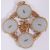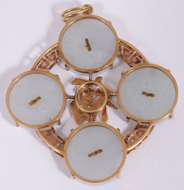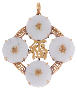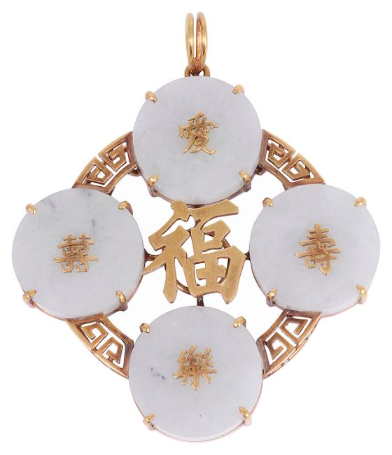 four jade roundels with Chinese characters applied to the centre of each, and larger Chinese characters to the centre with a Greek key circular border and split bale, marked 18k