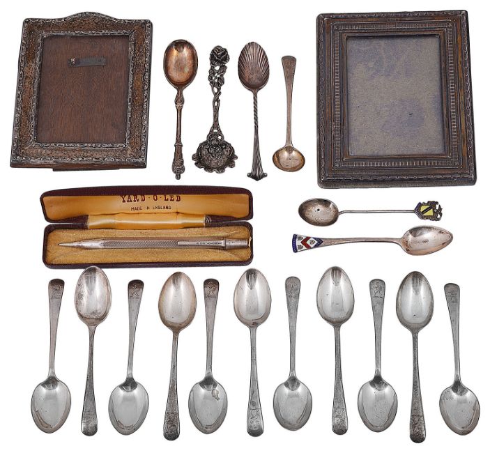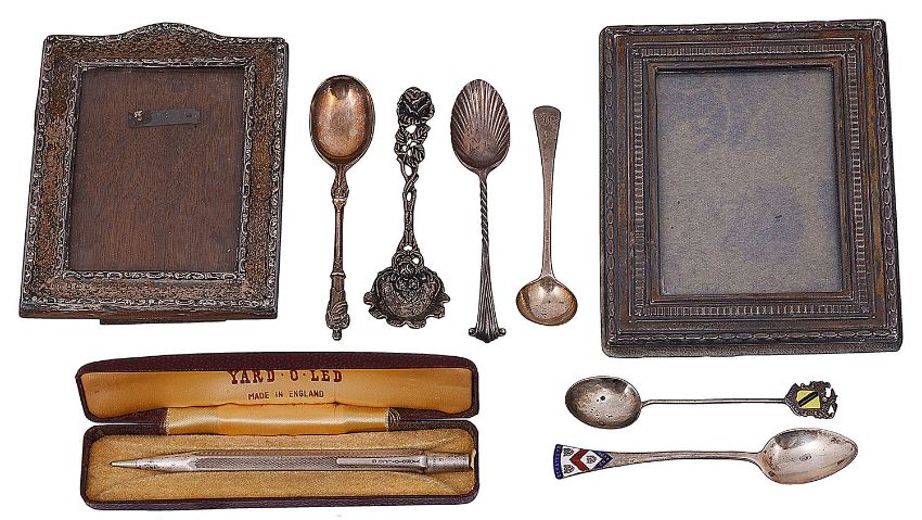 A selection of 20th century silver to include two small rectangular photograph frames, a Yard O Led pencil and coffee spoons