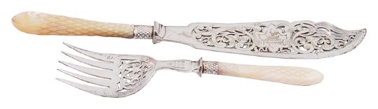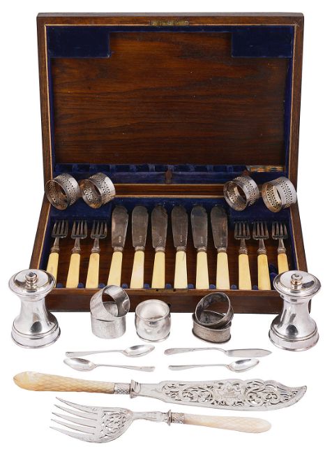 comprising a George V set of six silver fish knives and forks