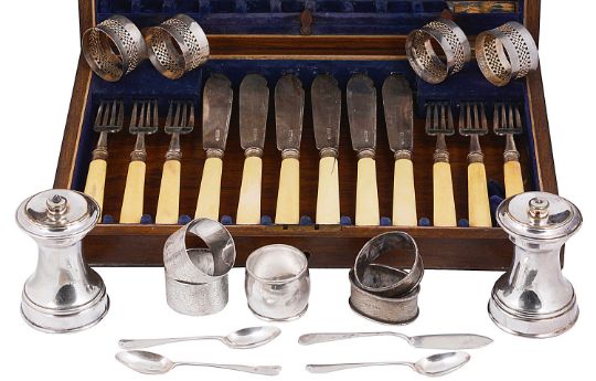 with a pair of late Victorian silver napkins rings, other assorted napkin rings to include an unmarked white metal set of four with pierced decoration, a butter knife, three coffee spoons, a pair of Victorian mother of pearl handled silver plated fish servers and a pair of French Peugeot Freres silver plated capstan pepper grinders, (qty)